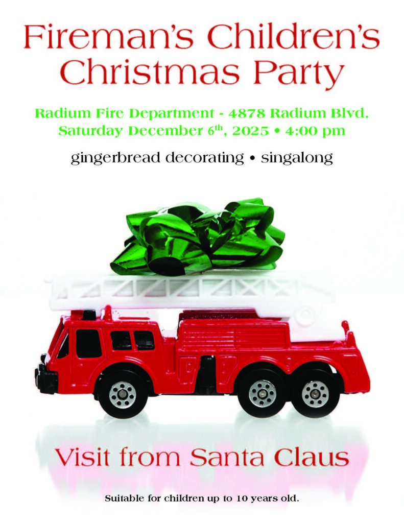 It’s that time again! The Radium Volunteer Fire Department members invite your family to their annual Children’s Party. See you soon!
